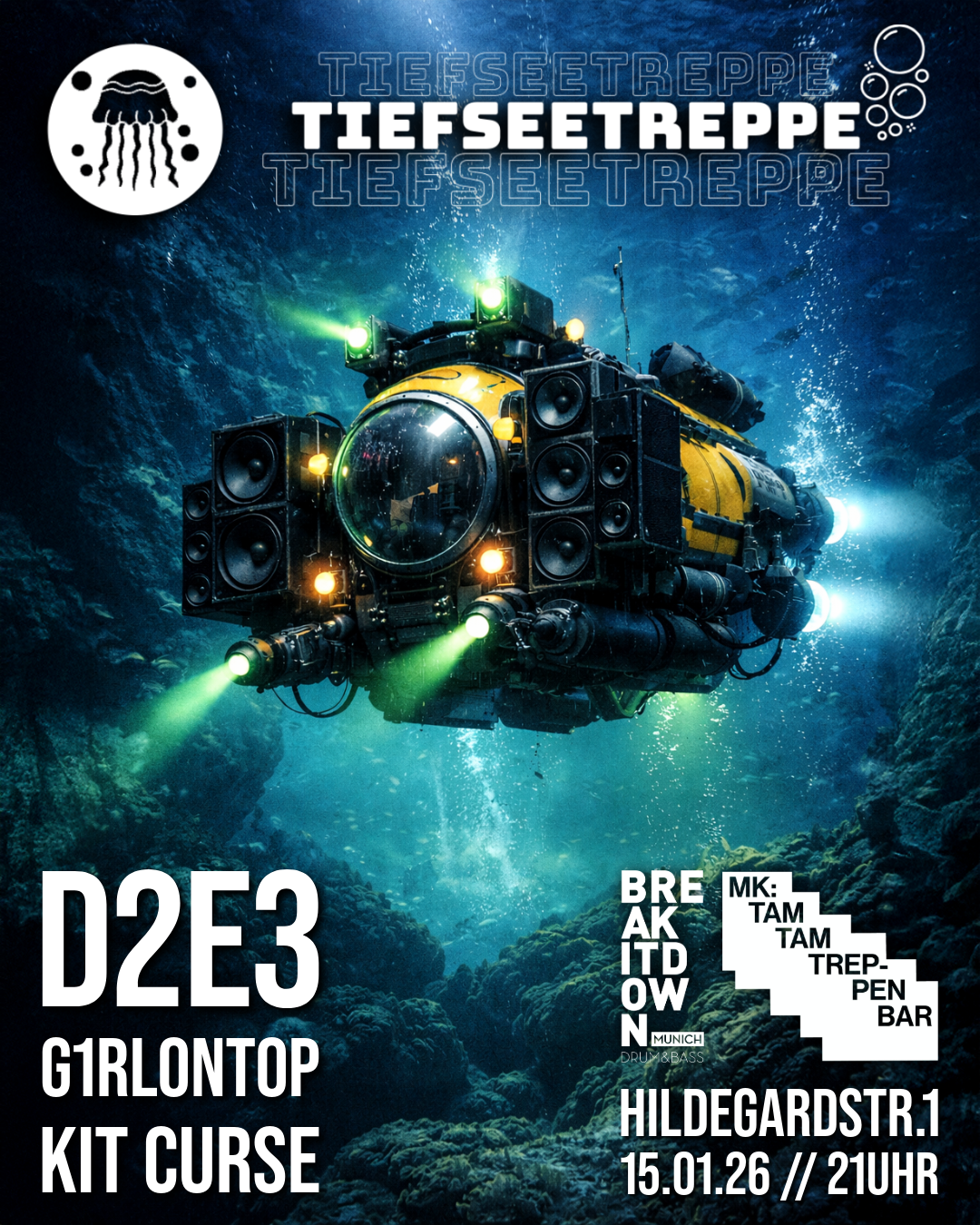 Am 15. Januar öffnen wir bereits zum fünften Mal die Pforten zur Tiefseetreppe. Diesmal taucht unser Unterwasser-U-Boot mit 160–175 BPM durch Drum & Bass, Jungle, Footwork und andere Bassströmungen. Mit an Bord sind diesmal D2E3, G1rlontop und Kit Curse.